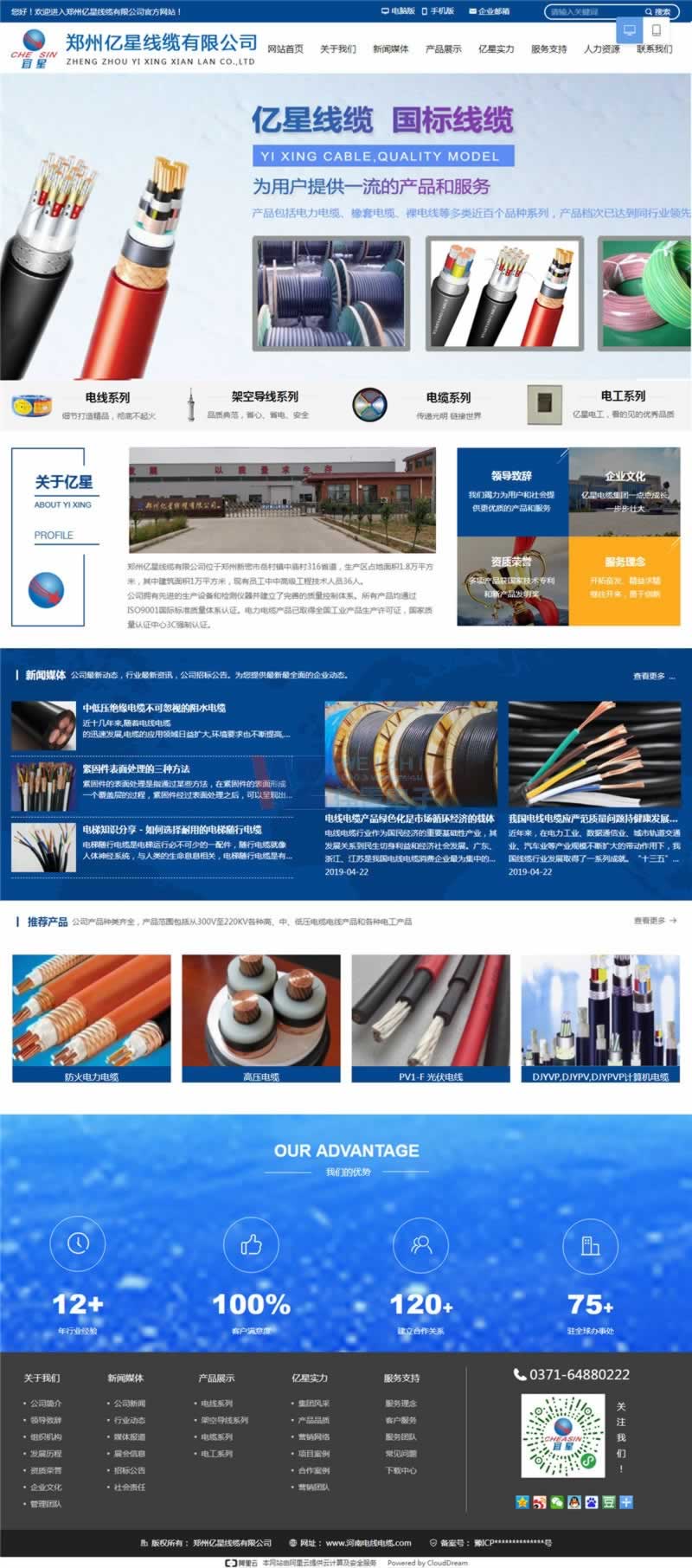 鄭州億星電力線纜整站布局采用長屏版式,色彩飽滿豐富,清晰的展示了該公司、產(chǎn)品、新聞等內(nèi)容。圖片效果體驗更好。