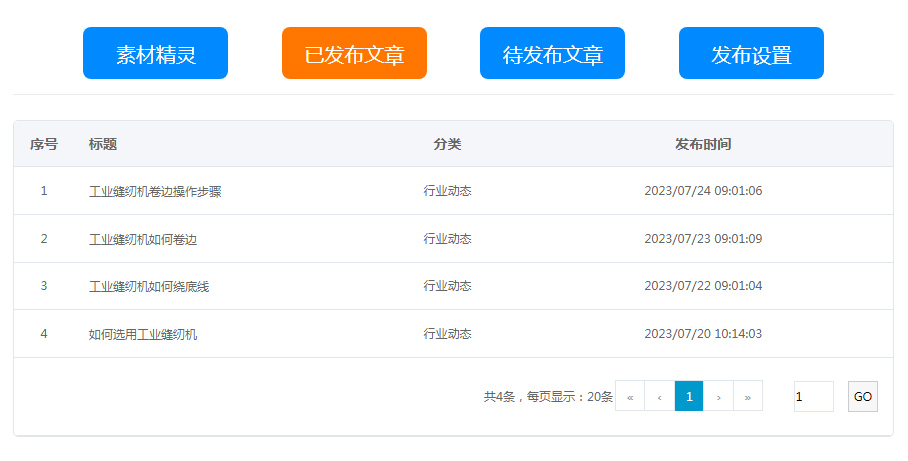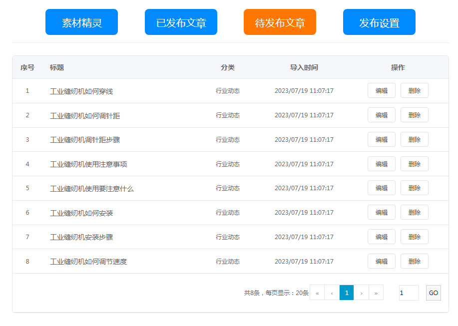 待發(fā)布文章:素材精靈里生成獲取的文章內(nèi)容,導(dǎo)入進(jìn)來,等待發(fā)布到網(wǎng)站上,支持二次修改與刪除;