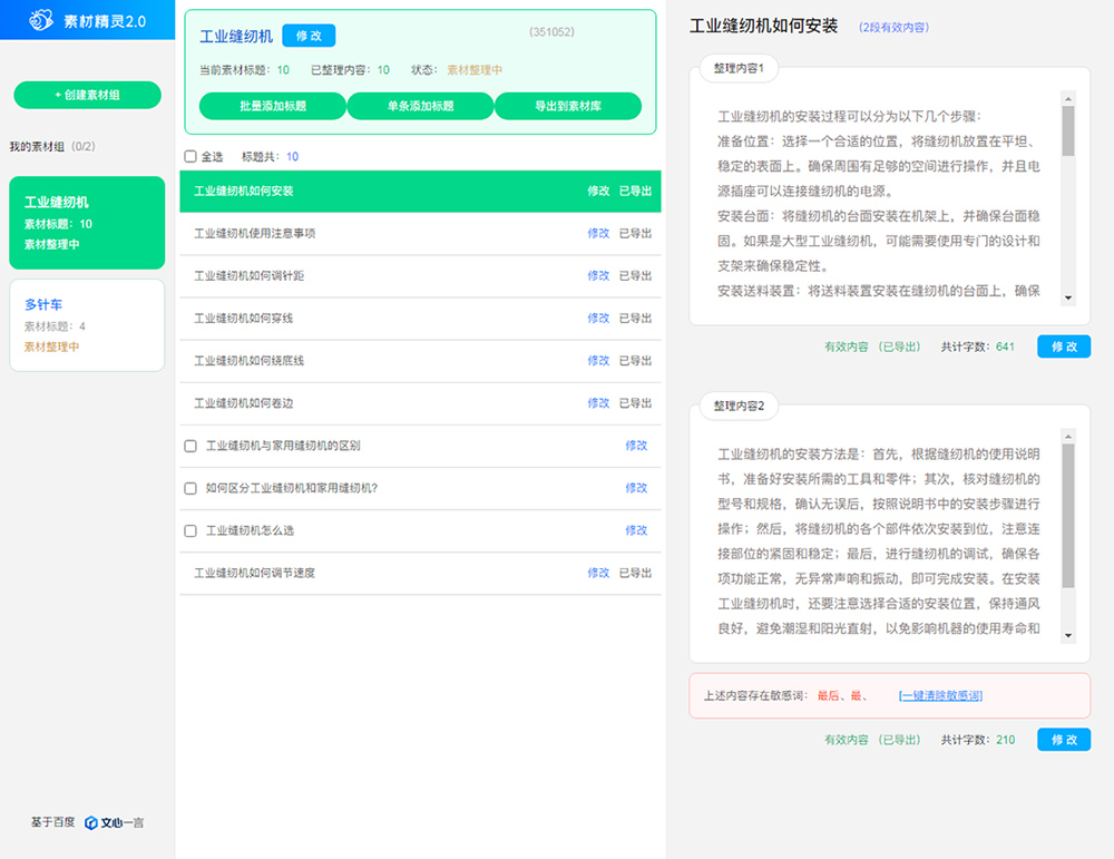 基于百度文心一言,阿里通義千問,AIGC根據(jù)標(biāo)題來生成內(nèi)容,每個標(biāo)題,最多3段內(nèi)容,遇到敏感詞,會提示出來。
