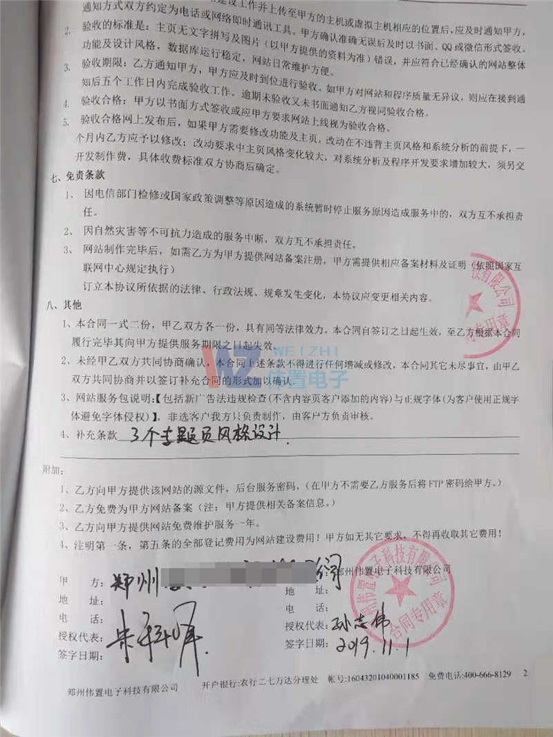 11月1日下午5點(diǎn)半左右,教培云負(fù)責(zé)人來我們公司做客,雙方就網(wǎng)絡(luò)推廣方面進(jìn)行了長時間溝通。客戶網(wǎng)站比較老,五六年的網(wǎng)站,在我們推廣師的建議客戶選擇了網(wǎng)站改版合作項目。最后,鄭州教培云教育科技有限公司選擇了與我們偉置網(wǎng)絡(luò)公司簽定了網(wǎng)站建設(shè)合同。以下為雙方簽訂的合同書。